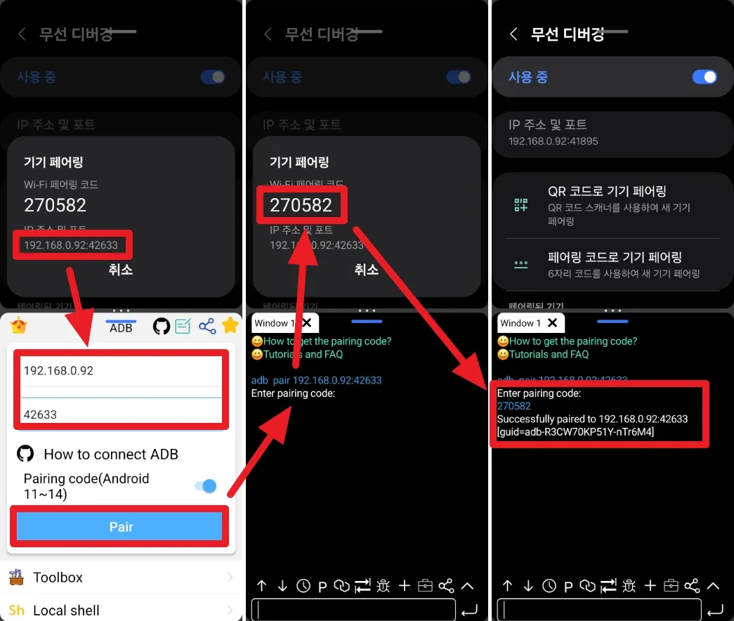 - 나머지 한쪽 화면에는 갤럭시 [설정 > 개발자 옵션 > 무선 디버깅 > 페어링 코드로 기기 페어링] 화면을 띄워주세요. 기기 페어링 화면에는 <페어링 코드>와 <IP:port>번호가 나옵니다. 먼저 <IP:Port>를 ADB 앱에 입력합니다. 그리고 하단의 Pair버튼을 누르면 터미널창이 열리며 페어링 코드를 입력하라고 합니다. 이때 기기 페어링 화면에 뜬 페어링 코드를 입력해주세요.