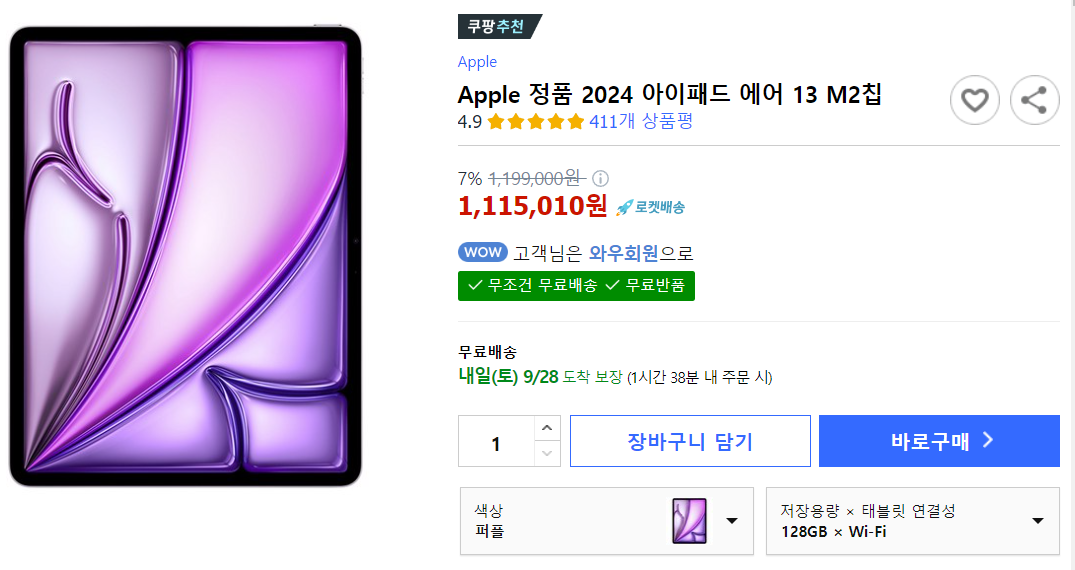 쿠팡 아이패드 에어 할인 링크 걸어드릴게요. 아래 바로가기 링크를 통해 원하시는 색상과 용량을 선택하시면 됩니다.
