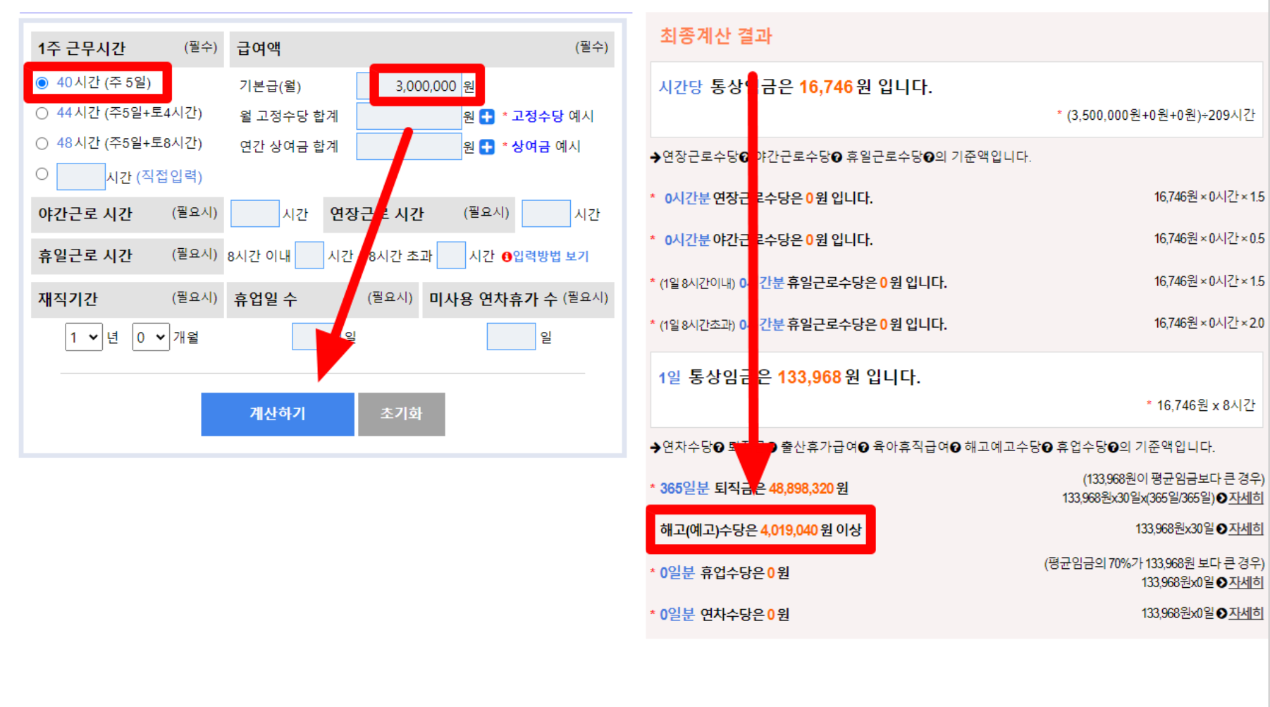 - 계산기 사용방법 : 1주 근무시간과 기본급을 입력한 뒤, [계산하기] 버튼을 누르면 하단에 예상되는 해고수당이 나옵니다.