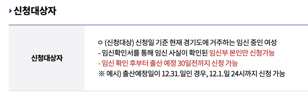| 지원대상 | 신청일 기준 경기도 거주, 임신 중인 여성 (임신확인서 필요) |