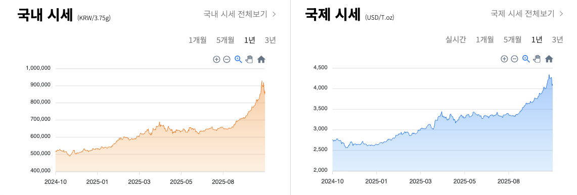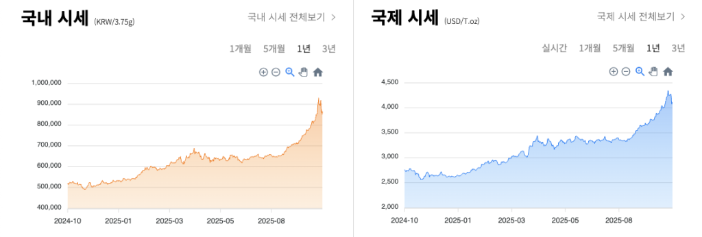 김치프리미엄(김프)은 원래 가상자산에서 쓰던 말이지만, 최근 금에도 그대로 나타났어요. 2025년 10월 중순 기준으로 국내 금 현물은 1g당 약 222,000원, 국제 금은 1g당 약 199,000원 선이었고 괴리율이 대략 +11%대로 벌어졌습니다. 같은 100g 골드바를 산다고 가정하면 국제 가격이면 약 1,992만 원, 국내에선 약 2,220만 원이니, 시작부터 200만 원대 ‘프리미엄’을 안고 들어가는 셈이죠.