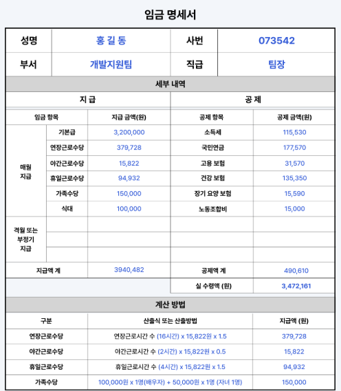 예를 들어, 연장근로수당은 “연장근로시간 × 통상시급 × 1.5”와 같은 방식으로 계산 근거를 함께 기재해야 합니다. 그래야 근로자가 제대로 지급받고 있는지 확인할 수 있죠.
