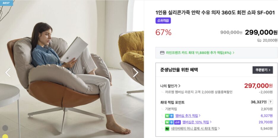 정가 900,000원이지만, 네이버 쇼핑 할인과 멤버십 혜택을 적용하면 299,000원대 이하로 구매 가능했습니다. 아래 제가 구매한 최저가 구매처 링크 남겨놓을게요.