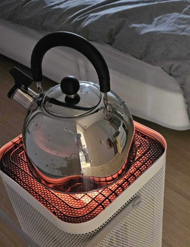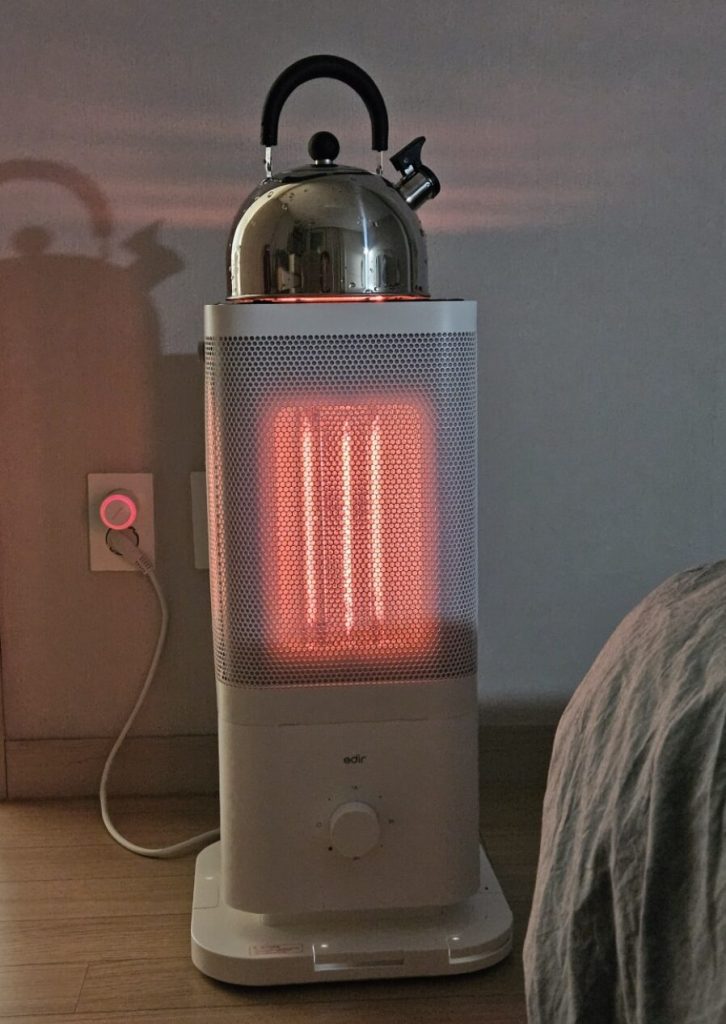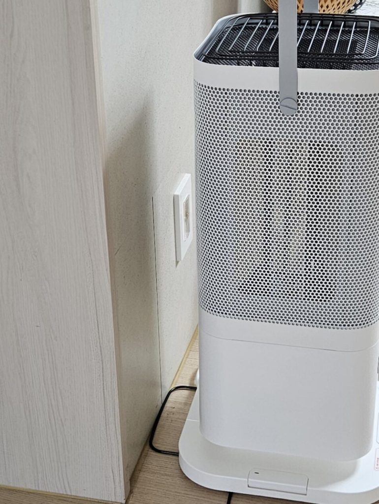 덕분에 오랜 시간 틀어놔도 눈이 뻑뻑하거나 목이 칼칼한 느낌이 전혀 없었어요. 게다가 팬이 돌아가는 소리가 아예 없는 무소음(0dB)이라, 침실에 두고 자거나 조용히 책을 읽을 때도 거슬리지 않아 좋았어요. 상단 그릴망 위에 주전자를 올려두면 가습 효과까지 낼 수 있어서, 겨울철 습도 관리에는 이만한 게 없다는 생각이 들었습니다.