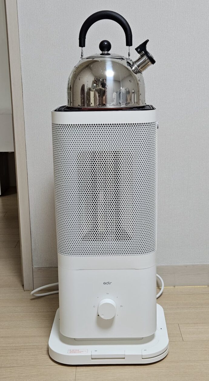 덕분에 오랜 시간 틀어놔도 눈이 뻑뻑하거나 목이 칼칼한 느낌이 전혀 없었어요. 게다가 팬이 돌아가는 소리가 아예 없는 무소음(0dB)이라, 침실에 두고 자거나 조용히 책을 읽을 때도 거슬리지 않아 좋았어요. 상단 그릴망 위에 주전자를 올려두면 가습 효과까지 낼 수 있어서, 겨울철 습도 관리에는 이만한 게 없다는 생각이 들었습니다.