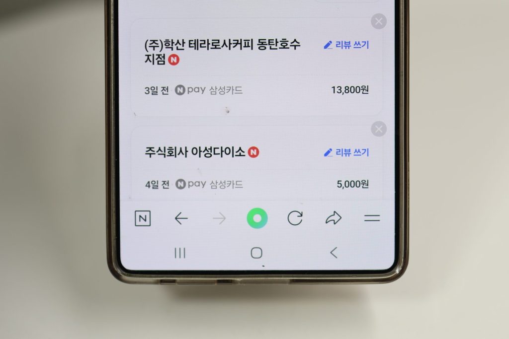 저처럼 네이버페이 앱에 마이데이터를 연동했다면 [결제 내역] 탭에 모든 내역이 나오기 때문에 실물 영수증 없이도 영수증 인증 리뷰가 가능합니다.
