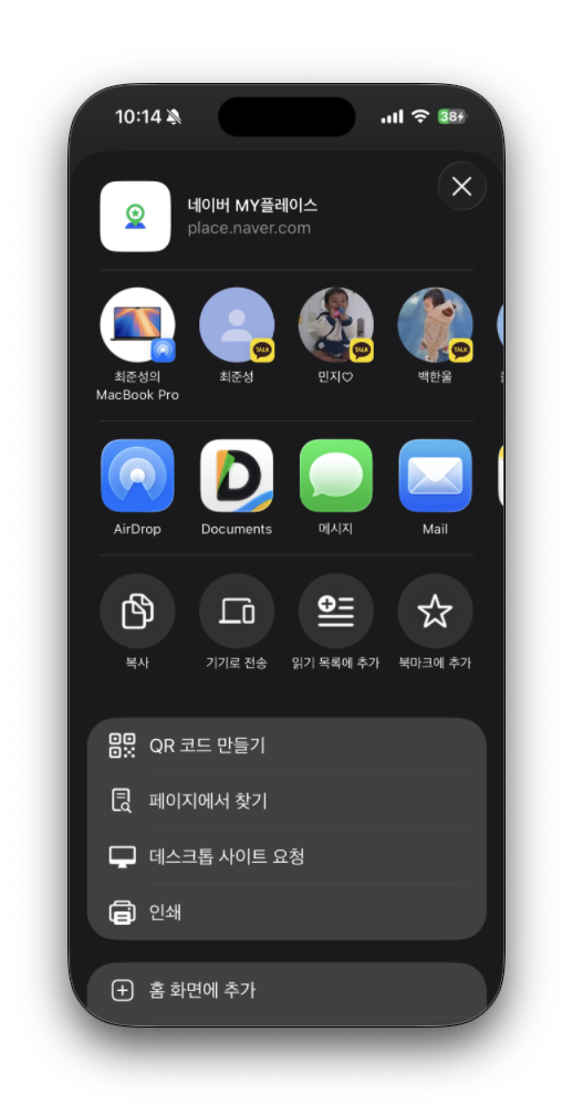 하단에 보이는 [홈 화면에 추가] 버튼을 누르면 아이콘을 생성할 수 있어요.