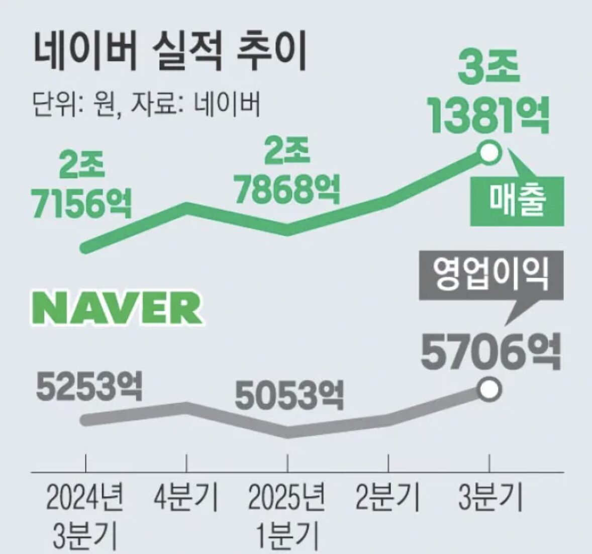 네이버의 2025년 3분기 숫자부터 간단히 짚어볼게요. 연결 기준 매출은 3조1381억원, 영업이익은 5706억원이었습니다. 전년 같은 기간보다 매출은 15.6%, 영업이익은 8.6% 늘었어요. ‘역대 최대 분기 실적’이라는 표현을 써도 과하지 않은 수준입니다.