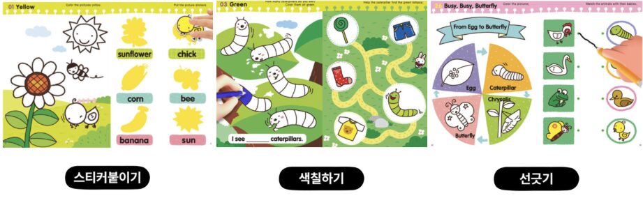 워크북에는 스티커 붙이기, 색칠하기, 선 긋기 등 다양한 놀이 활동이 들어 있어서 책에서 배운 내용을 한 번 더 복습하며 사고력을 확장할 수 있어 좋았어요.