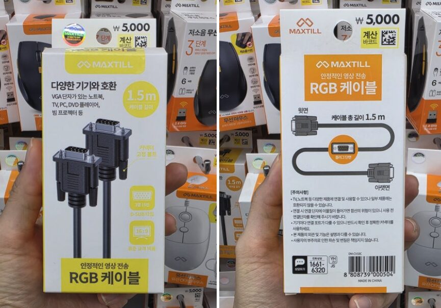 RGB(VGA) 케이블은 파란색 15핀 단자로 되어 있는 아주 오래된 방식입니다. 아날로그 신호라서 장거리에선 화질이 흐려질 수 있고, 소리는 따로 연결해야 합니다. 다이소에서 MAXTILL 브랜드로 나온 RGB 케이블을 약 5,000원 정도에 볼 수 있는데, 공장·관공서·학교처럼 구형 프로젝터나 모니터를 아직도 쓰는 곳에서 여전히 유용합니다.