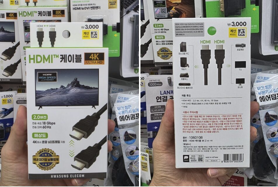 첫 번째는 HDMI 2.0 케이블 (약 3,000원, 4K 60Hz 지원)이에요. 보통 2m 길이로 많이 팔리고, 4K 해상도에 60Hz까지 지원해서 넷플릭스, 디즈니플러스, 유튜브 4K 영상을 보기엔 충분합니다. FHD(1920×1080) 모니터나 4K 60Hz TV를 쓰고 있다면 이걸로도 부족함이 없습니다.