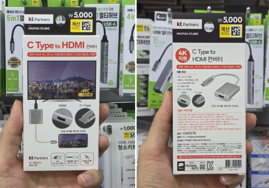 다이소에서 파는 C타입 to HDMI 컨버터는 대략 5,000원 정도이고, 4K 30Hz까지 지원하는 제품이 많습니다. 길이는 본체 부분 포함해서 10~11cm 정도라 아주 짧고, 여기에 일반 HDMI 케이블을 더 연결해서 쓰는 방식이에요.