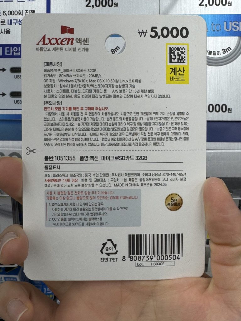 다이소에서 가장 흔하게 볼 수 있는 제품은 샌디스크 micro SDHC 32GB 카드예요. 가격은 5천원이여서 큰 부담 없이 집어 들 수 있는 수준입니다. 브랜드가 샌디스크라는 점에서 기본적인 신뢰도는 있는 편이에요.
