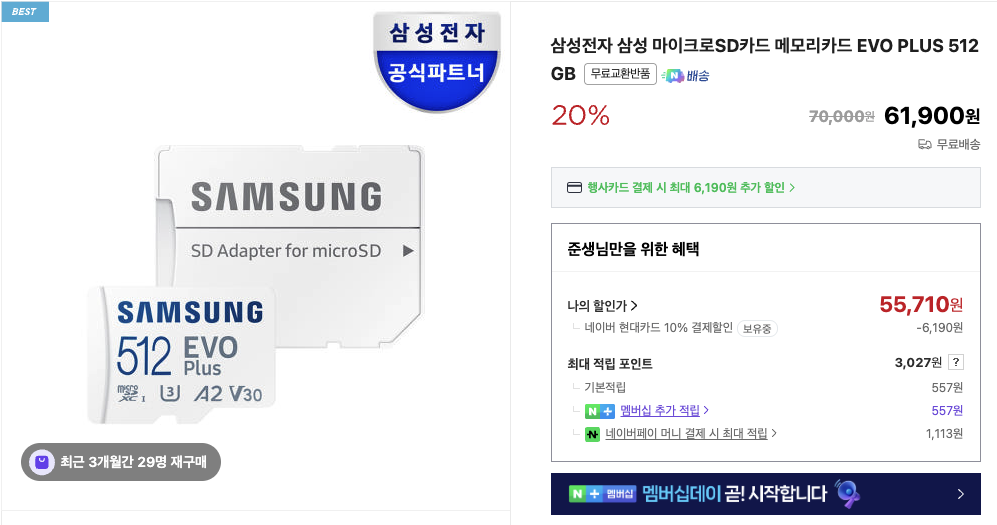하지만 4K 영상, 액션캠카메라 연사 촬영처럼 데이터 처리량이 많은 환경이라면 처음부터 V30급 이상의 상위 등급·대용량 SD카드로 가는 것을 추천드립니다. 제가 현재 구매하고 사용중인 삼성 EVO 512GB V30 SD카드는 아래 링크남겨드릴테니 가격 확인해보세요.