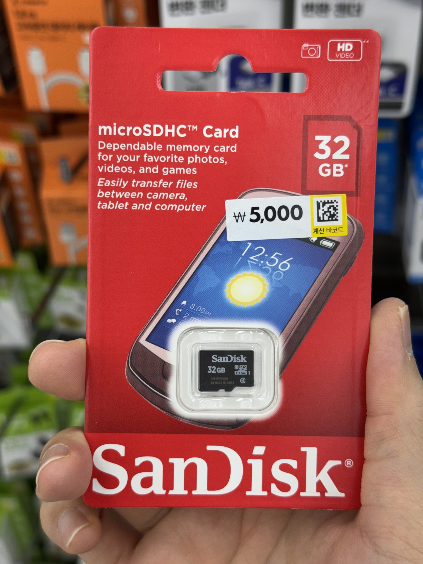 다이소에서 가장 흔하게 볼 수 있는 제품은 샌디스크 micro SDHC 32GB 카드예요. 가격은 5천원이여서 큰 부담 없이 집어 들 수 있는 수준입니다. 브랜드가 샌디스크라는 점에서 기본적인 신뢰도는 있는 편이에요.