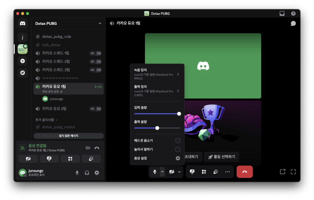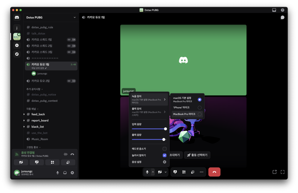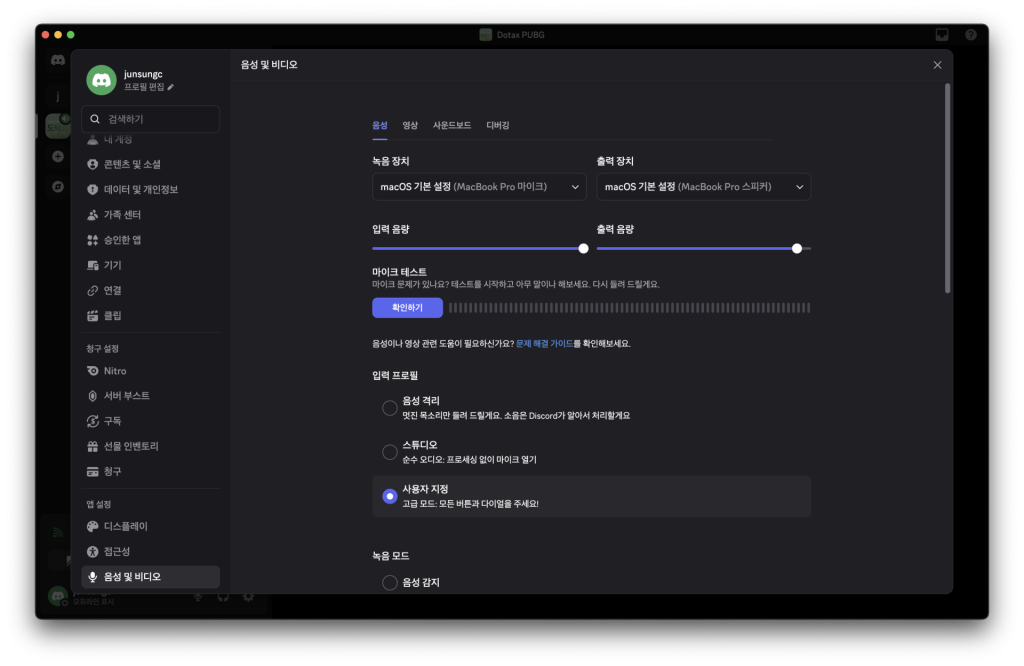 이곳에서 내 마이크가 정상적으로 동작하는 지 확인해보시고 음성 채널에 들어가면 좋겠죠?