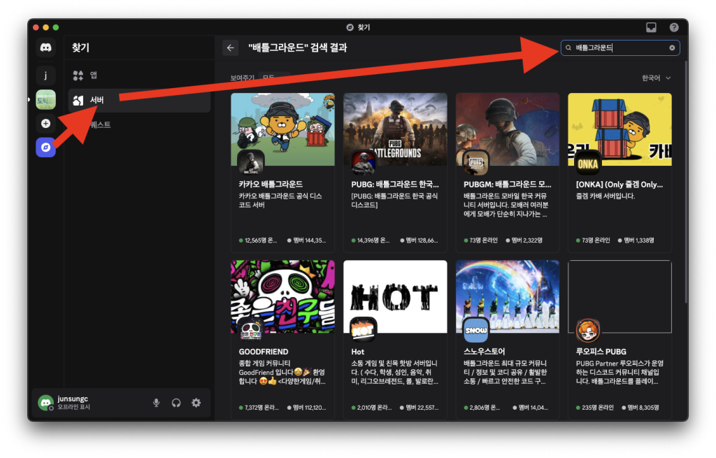 좌측 DM 아래에 있는 아이콘들은 [서버]입니다. 처음에는 서버가 아무것도 없을거에요. 하단의 탐색 버튼을 눌러서 내가 원하는 주제의 서버를 찾아서 들어갈 수 있어요. 예를 들어 배틀그라운드 라는 FPS 게임 서버를 들어가볼게요.
