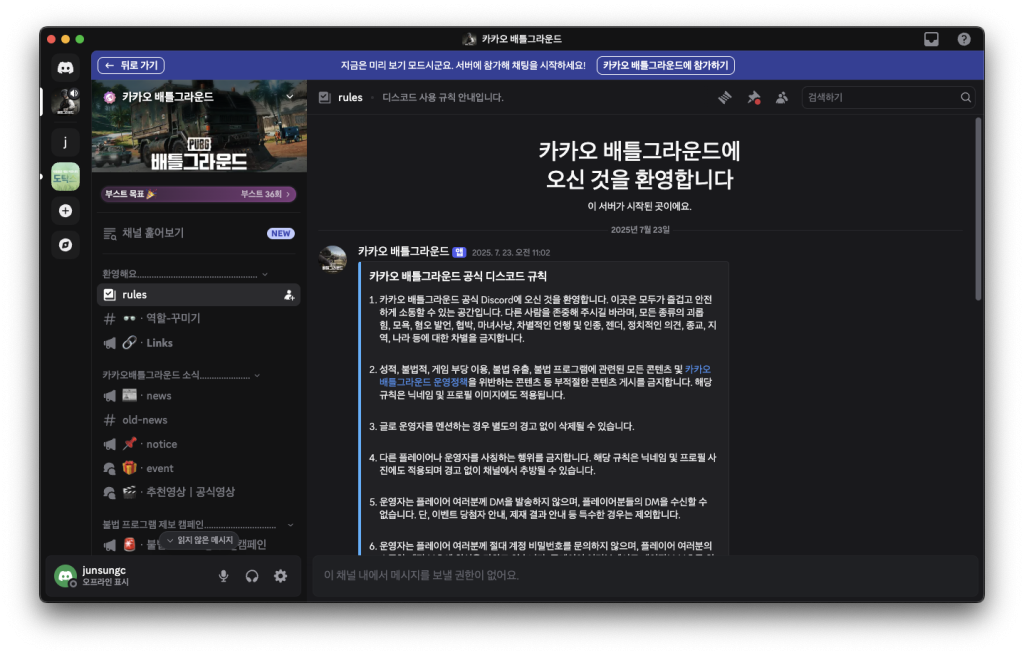 서버에 처음 들어가면 보통 [rules : 규칙] 보입니다. 이 서버의 규칙을 알 수 있으니 정독하시는 것이 좋습니다.
