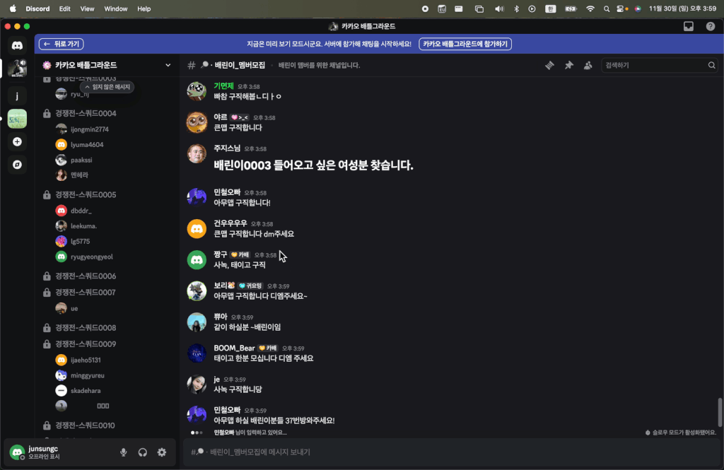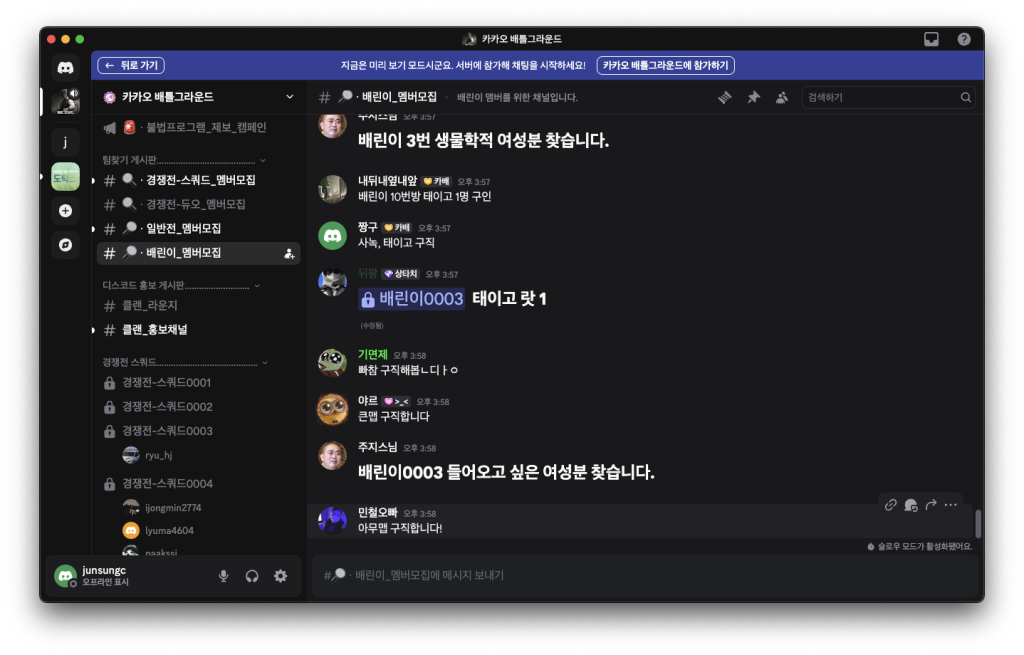 제가 접속한 [카카오 배틀그라운드] 서버내에서 # 으로시작하는 것이 채널입니다. 예를들어 [배린이_멤버모집] 채널에 들어가보니, 위와같이 사람들이 같이 게임할 사람을 구하고 있는 것을 볼 수 있죠.