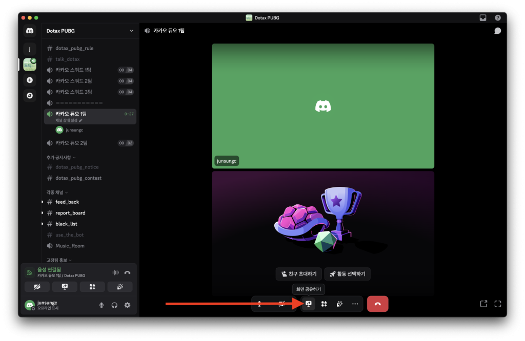 화면 공유는 음성 채널에 들어간 뒤하단에 있는 모니터 모양 버튼을 누르면 됩니다. 전체 화면 또는 특정 창만 공유하는 선택이 가능합니다. 전체화면을 공유하기보다는 브라우저나 특정 애플리케이션 공유만 하는 것이 안전합니다.