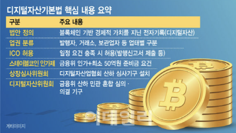 디지털자산기본법은 간단히 말해, 지금까지 회색지대에 있던 가상자산을 제도권 안으로 편입시키는 첫 번째 종합법이에요. 가상자산의 발행, 거래, 관리를 모두 포함해 법적 틀을 마련하는 것이 핵심입니다. 즉, “코인도 이제는 정부가 공식적으로 인정하는 자산이 된다”는 의미로 볼 수 있습니다.