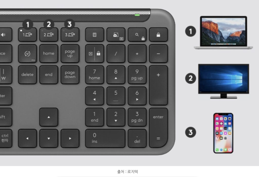 제가 이 제품을 선택한 결정적인 이유 중 하나는 바로 멀티 디바이스 연결 기능 때문입니다. 저는 업무용 윈도우 노트북과 개인용 맥북, 그리고 아이패드까지 총 3대의 기기를 번갈아 가며 사용하는데요. K950은 이지 스위치 버튼 하나만 누르면 기기 간 전환이 즉각적으로 이루어져서 정말 편리했습니다.