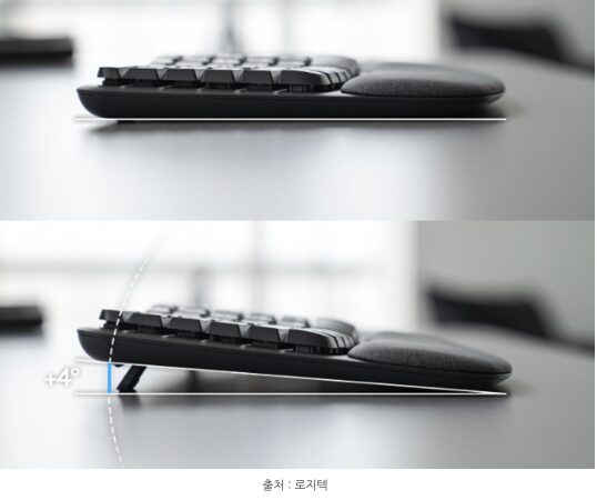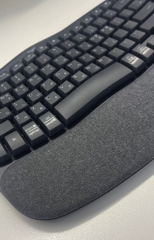 실제로 써보니 손을 키보드에 올렸을 때 어깨가 자연스럽게 벌어지고, 손목이 꺾이지 않은 상태로 타이핑이 가능해서 정말 편했어요. 키보드가 완전히 분리된 형태가 아니기 때문에, 독수리 타법을 쓰시거나 일반 키보드에 익숙한 분들도 별도의 적응 기간 없이 바로 사용할 수 있다는 점이 가장 큰 장점이었습니다.
