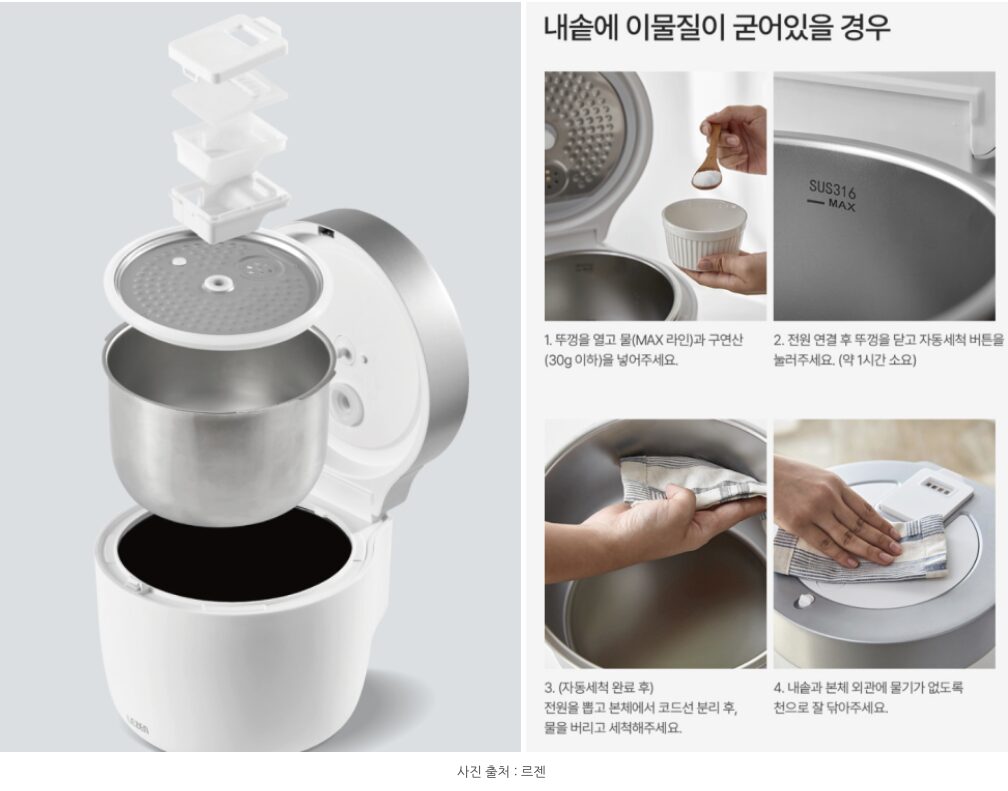 또한 자동 세척 기능이 포함되어 있어서 관리가 훨씬 수월해졌어요. 내솥과 뚜껑 부분은 전해연마 처리가 되어 있어서 처음 제품을 받았을 때 귀찮은 연마제 제거 작업 없이 바로 사용할 수 있었던 점도 소소한 장점이었지요.