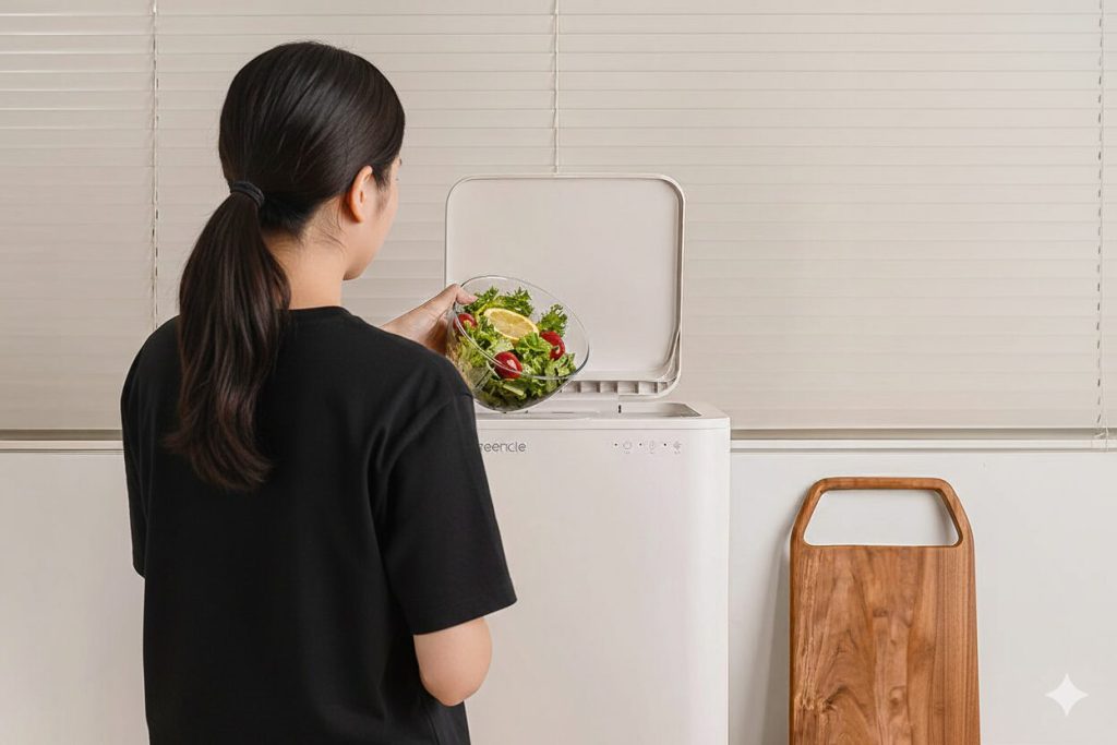 또한, 음식물이 생길 때마다 수시로 투입할 수 있다는 점이 정말 큰 장점이에요. 건조 분쇄 방식은 한 번 돌리면 끝날 때까지 기다려야 하지만, 린클 이지는 뚜껑을 열고 언제든지 추가로 넣을 수 있어서 쓰레기가 쌓일 틈이 없습니다.
