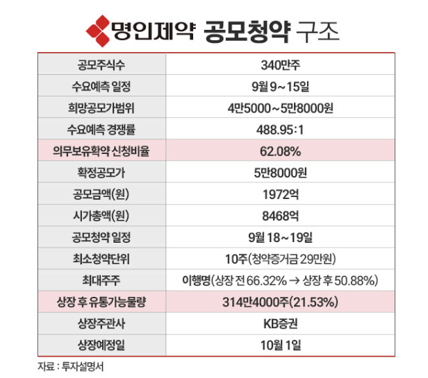 명인제약은 수요예측에서도 좋은 성과를 거뒀습니다. 경쟁률은 488대 1, 의무보유확약 비율은 62.08%로 집계됐습니다. 이는 상장 직후 시장에 풀리는 유통 가능 물량이 적다는 의미이기도 해요. 실제로 전체 상장 예정 주식 수 1,460만 주 중 유통 가능 물량은 약 314만 주(21.53%)에 불과합니다.