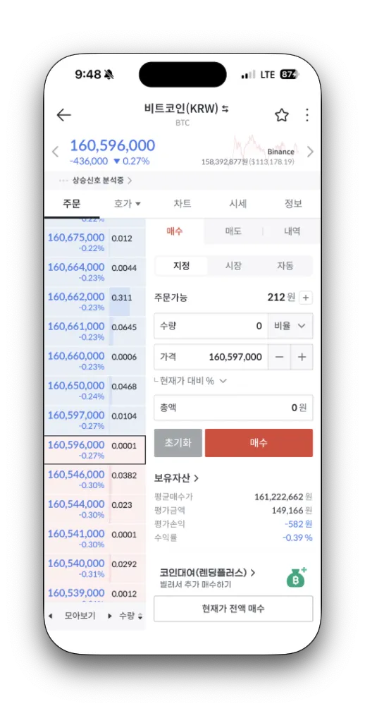 참고로 현재 비트코인(BTC) 1개는 1억6천만원이므로, 소수점으로 끊어서 주문을 할 수 있어요.