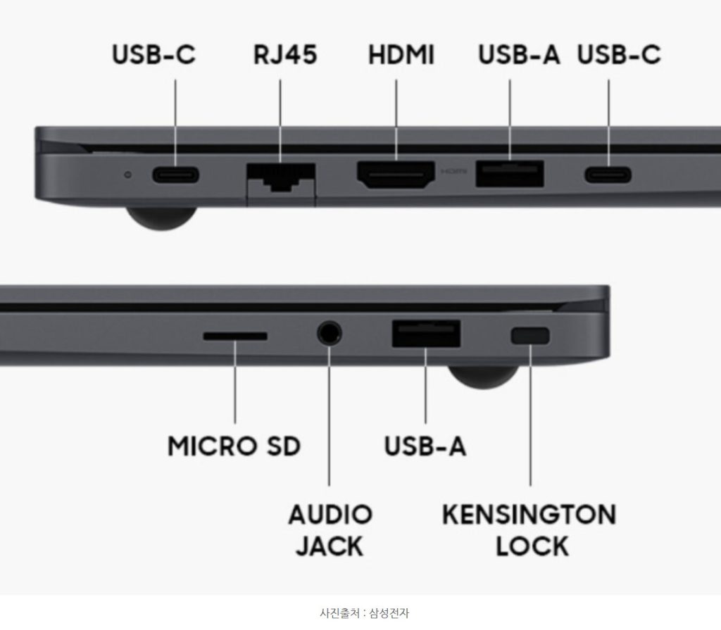 이 제품은 별도의 멀티 포트 어댑터를 챙길 필요가 없을 만큼 포트 구성이 아주 다채롭습니다. HDMI 포트는 물론이고 USB-C 2개, USB-A 2개, 마이크로 SD 슬롯, 그리고 유선랜 포트까지 갖추고 있어요. 요즘 얇은 노트북들은 포트를 줄이는 추세라 불편할 때가 많은데, 갤럭시북4는 다양한 포트 덕분에 주변 기기를 바로 연결할 수 있어 정말 편했습니다. 특히 회의실에서 프로젝터에 연결하거나 외장 하드를 사용할 때 수고로움이 줄어들어 만족도가 높았어요.