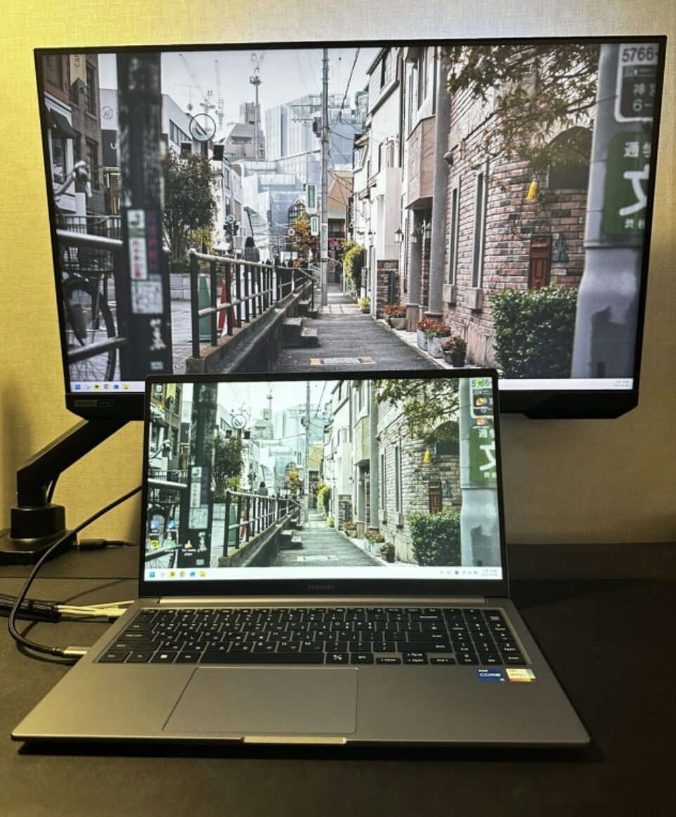 이 제품은 별도의 멀티 포트 어댑터를 챙길 필요가 없을 만큼 포트 구성이 아주 다채롭습니다. HDMI 포트는 물론이고 USB-C 2개, USB-A 2개, 마이크로 SD 슬롯, 그리고 유선랜 포트까지 갖추고 있어요. 요즘 얇은 노트북들은 포트를 줄이는 추세라 불편할 때가 많은데, 갤럭시북4는 다양한 포트 덕분에 주변 기기를 바로 연결할 수 있어 정말 편했습니다. 특히 회의실에서 프로젝터에 연결하거나 외장 하드를 사용할 때 수고로움이 줄어들어 만족도가 높았어요.