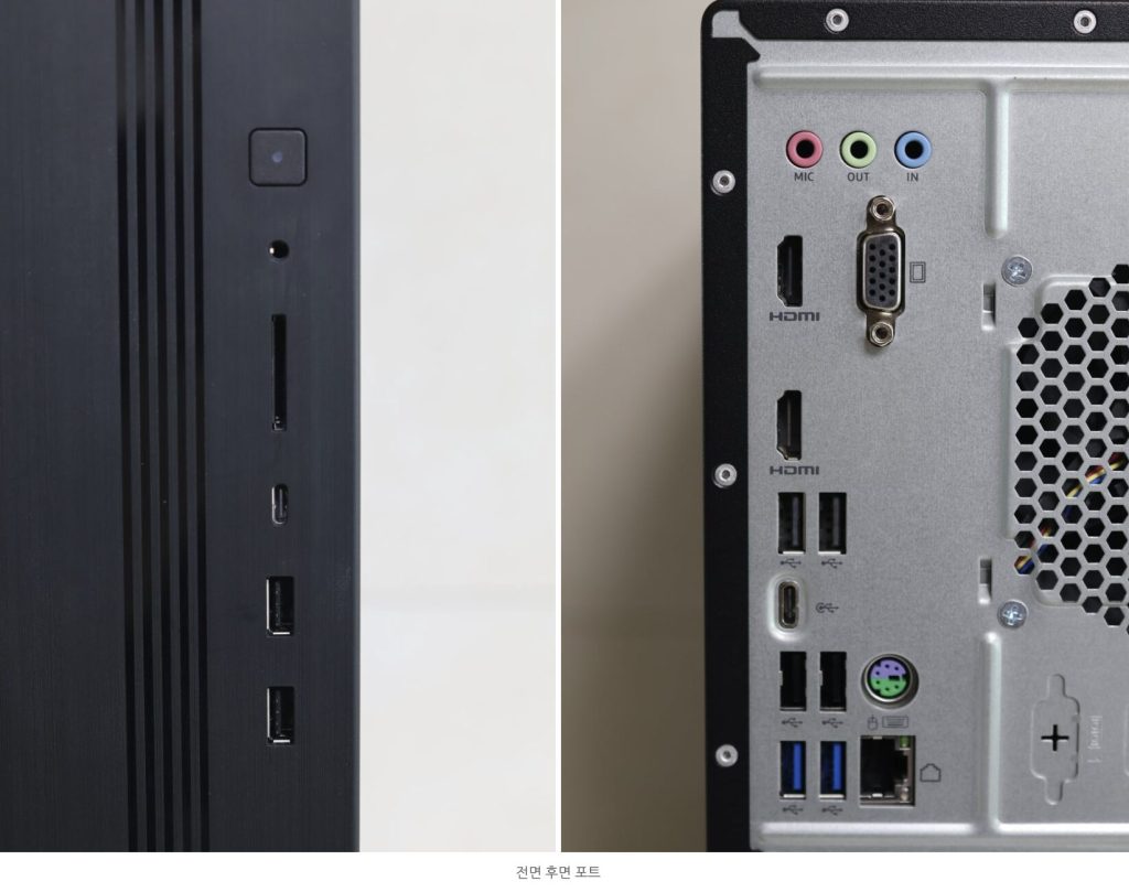 기본 구성품으로 무선 키보드와 무선 마우스를 제공해 주는 점도 마음에 들었습니다. 선 없는 책상을 선호하는 저에게는 따로 주변기기를 살 필요가 없어 경제적이었어요. 전면과 후면에 USB 포트와 C타입 포트가 넉넉하게 배치되어 있어 외장 하드나 주변 기기를 연결하기에도 수월했습니다.