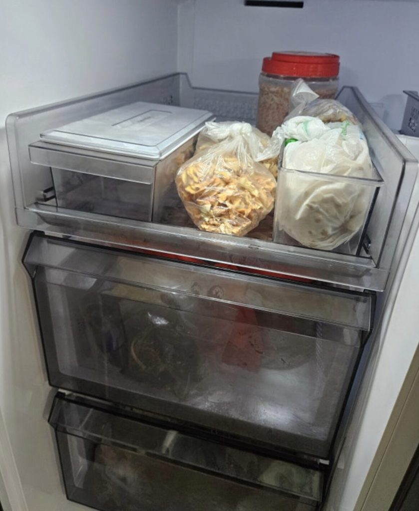 기능적으로는 나무랄 데 없지만 902L 대용량 모델이다 보니 깊이가 922mm로 꽤 깊은 편이에요. 일반적인 주방 표준장보다 앞으로 툭 튀어나오는 프리스탠딩 타입이라 설치 전에 주방 공간의 깊이를 꼭 확인해 보셔야 해요. 주방이 좁은 집이라면 공간을 많이 차지한다고 느낄 수 있거든요. 하지만 그만큼 내부 용량이 커서 많은 양을 보관하기엔 최고의 선택이었어요.