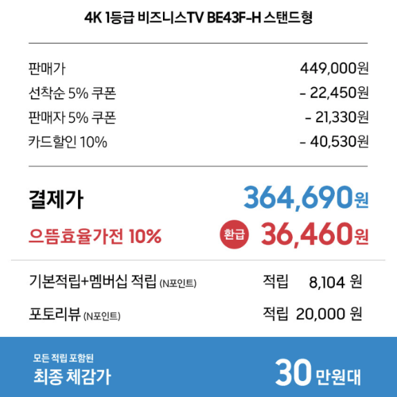 이 제품을 선택한 가장 큰 이유는 바로 압도적인 ‘가성비’ 때문입니다. 보통 대기업 4K TV를 사려면 가격 부담이 만만치 않은데요. 이 제품은 40만 원대 중반의 가격대를 형성하고 있으면서도, 삼성전자의 패널 품질을 그대로 누릴 수 있습니다.