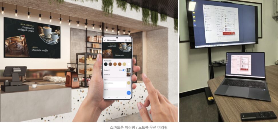 또한, 삼성 비즈니스 TV 앱과 삼성 VXT 솔루션을 제공하여 스마트폰 하나로 간편하게 TV 안에 띄울 콘텐츠를 관리할 수 있습니다. 복잡한 장비 없이도 메뉴 가격을 수정하거나, 신메뉴 홍보 이미지를 템플릿을 활용해 전문가처럼 제작하여 바로 TV로 송출할 수 있습니다. 이 기능은 사장님이 가게에 없어도 원격으로 관리가 가능하니 매장 운영의 효율이 비약적으로 상승하죠.