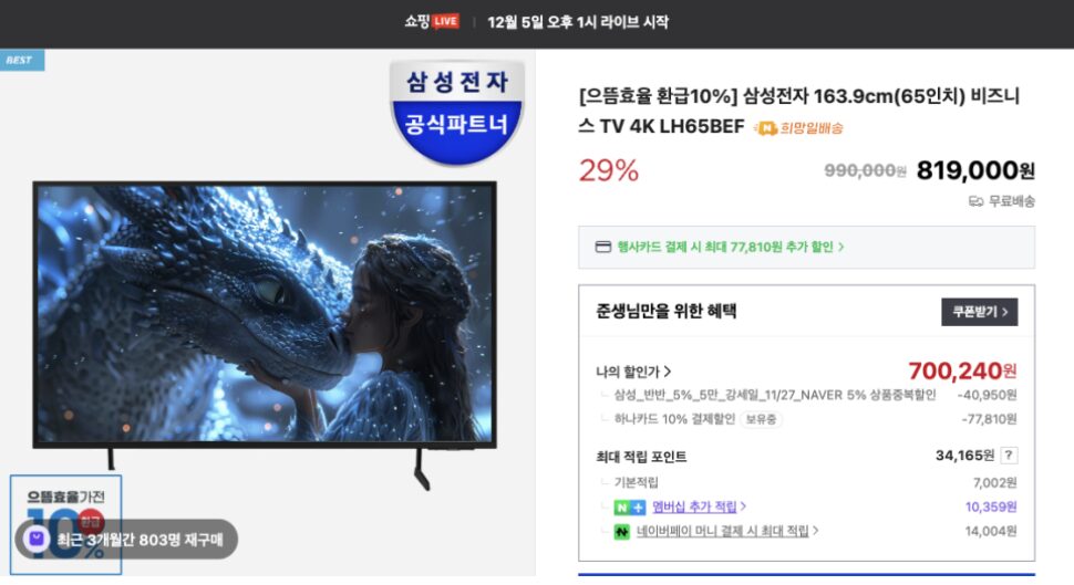 가격은 정가 기준 990,000원인데, 아래 링크를 통해 구입하면 약 29% 할인을 받아 700,240원에 구매할 수 있습니다. 여기에 으뜸효율 환급 10%까지 받으면 체감가는 훨씬 더 낮아집니다. 참고로 현재 으뜸효율 환급 예산이 80%가 소진되었다고 하니 서두르시는 것을 추천드립니다.