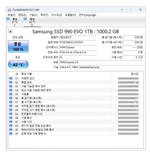 | 모델명 | 삼성전자 990 PRO NVMe M.2 SSD 1TB (MZ-V9P1T0BW) |