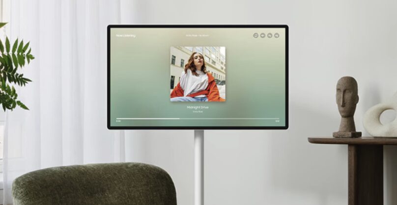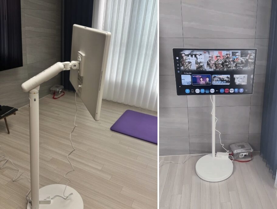 이게 왜 중요하냐면, 이동형 스크린 특성상 벽에 붙여두기보다는 거실 한가운데나 침대 옆에 두는 경우가 많기 때문입니다. 어느 각도에서 봐도 어색함이 없는 웜 화이트 컬러와 슬림한 두께 덕분에 집안 분위기가 한층 고급스러워졌습니다. 또한 4면이 모두 동일한 두께인 이븐 베젤(Even Bezel)이 적용되어 있어, 가로로 보든 세로로 돌려 보든 시각적인 안정감이 뛰어났습니다.