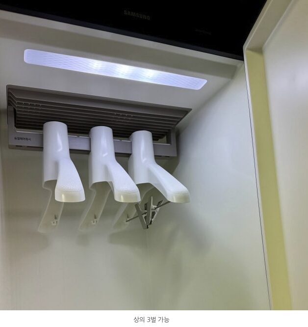 이 제품을 쓰면서 가장 마음에 들었던 점은 ‘먼지를 털어내는 방식’이었어요. 타사 제품 중에는 옷을 흔들어서 먼지를 터는 방식도 있는데, 이 제품은 강력한 바람을 위아래로 쏘아주는 듀얼 에어워시 방식을 채택했습니다.