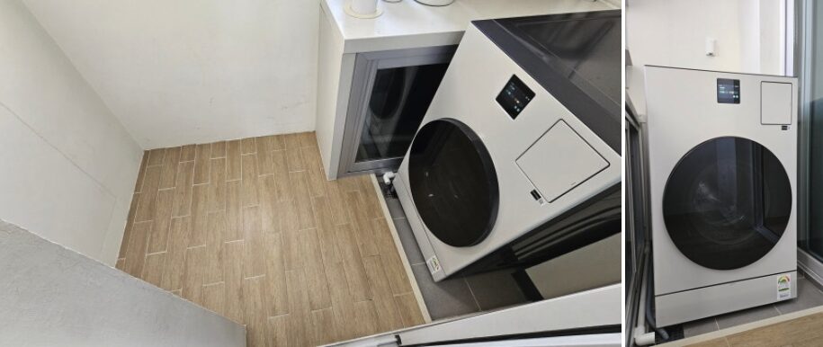 그리고 세탁기 한 대 분량의 공간만 있으면 되기 때문에 세탁실 공간을 40% 정도 절약할 수 있어요. 덕분에 건조기를 놓아야 했던 자리를 다른 용도로 활용할 수 있게 되어 세탁실 분위기가 한결 깔끔해졌습니다.