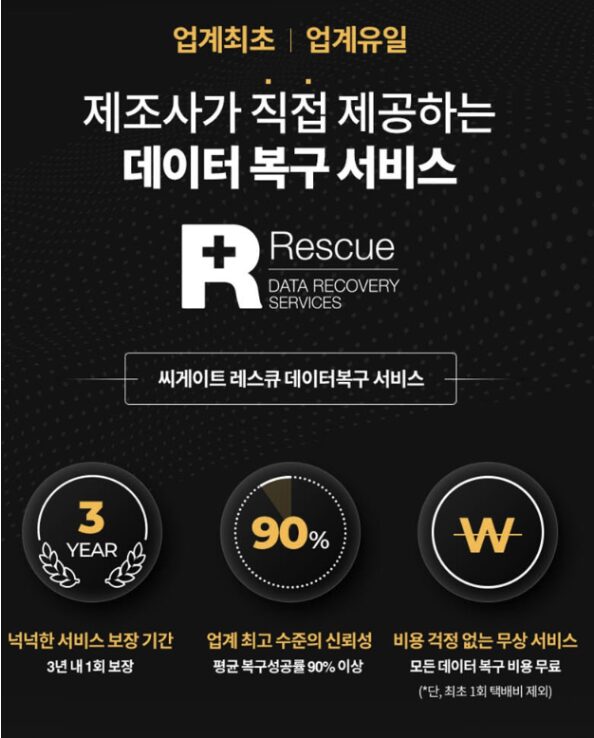 씨게이트는 업계 최초이자 유일하게 제조사가 직접 데이터 복구 서비스를 제공합니다. 외장하드를 쓰다 보면 뜻하지 않게 떨어뜨리거나, 물에 젖거나, 열에 의해 손상될 수 있잖아요. 일반적인 경우라면 사설 복구 업체에 맡겨야 하고 비용도 수십만 원이 깨지는데, 이 제품은 3년 보증 기간 내 1회에 한해 데이터 복구 비용이 무료입니다.