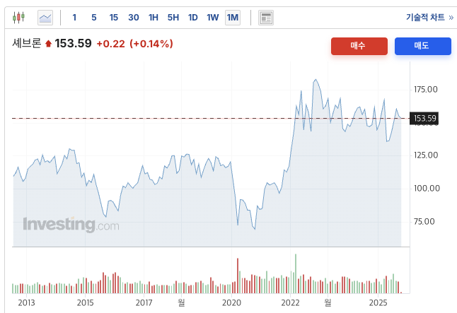 전문가들은 셰브론 주가가 150달러 이하로 내려오면 매수 기회로 보고, 170달러 부근에서는 차익 실현을 고려하라고 조언하고 있습니다. 유가 흐름이 주가의 가장 큰 변수이므로, 유가가 90달러 선까지 오른다면 165~170달러 돌파도 가능하지만, 반대로 유가가 70달러 초반까지 밀리면 주가가 150달러 밑으로 내려갈 수 있다는 점도 유념해야 합니다.