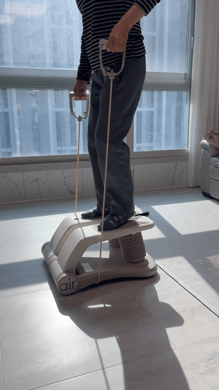 그런데 이 제품은 유압 실린더가 아닌 에어펌프 방식을 사용해서 무척 만족스러웠어요. 펌프 속의 공기가 하중을 쿠션처럼 받쳐주기 때문입니다. 덕분에 무릎 관절에 직접적인 충격이 덜 가해지고 오일 발열 관리가 따로 필요 없어서 안전하고 간편하게 운동할 수 있었어요. 공기가 순환되면서 한쪽을 누르면 다른 쪽이 올라오는 구조라 움직임도 아주 부드러웠습니다.