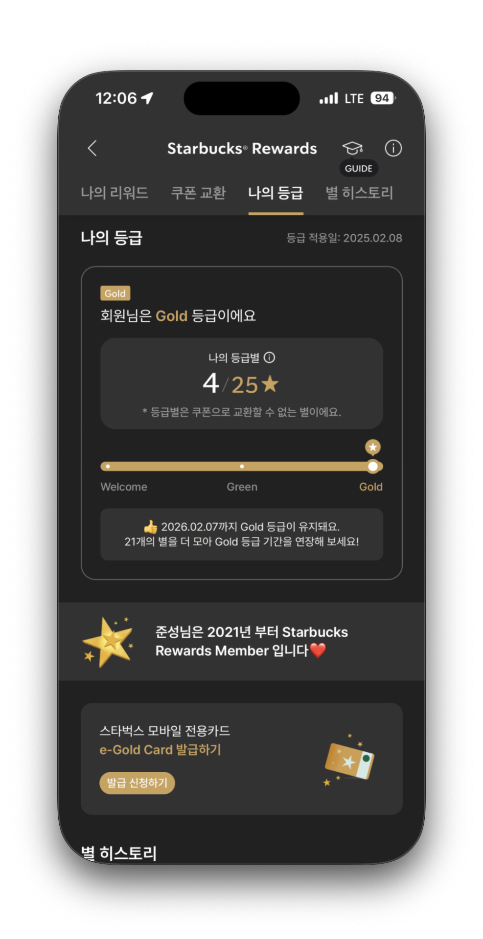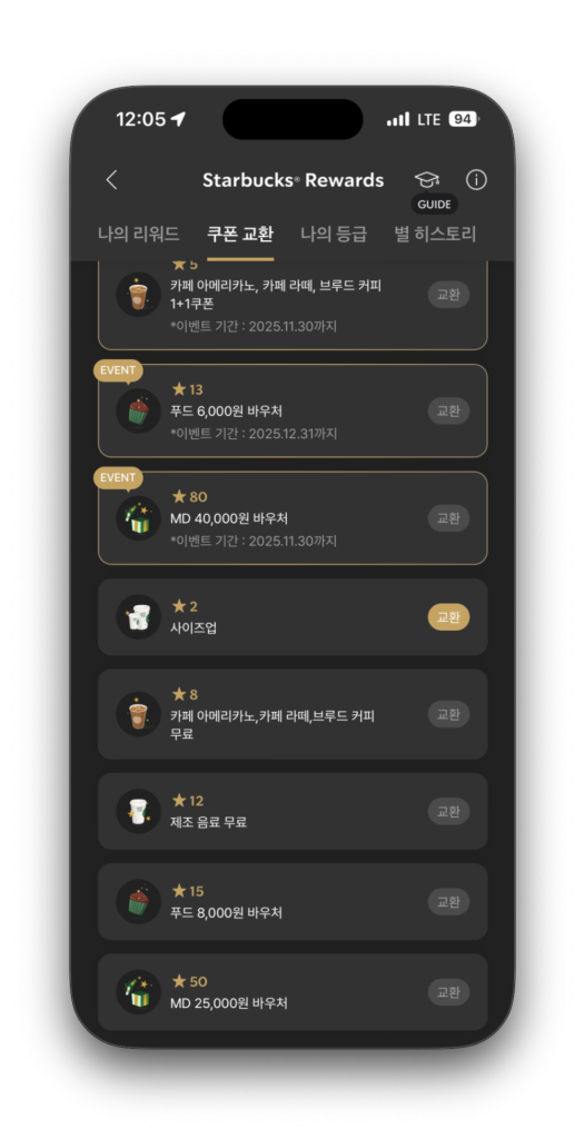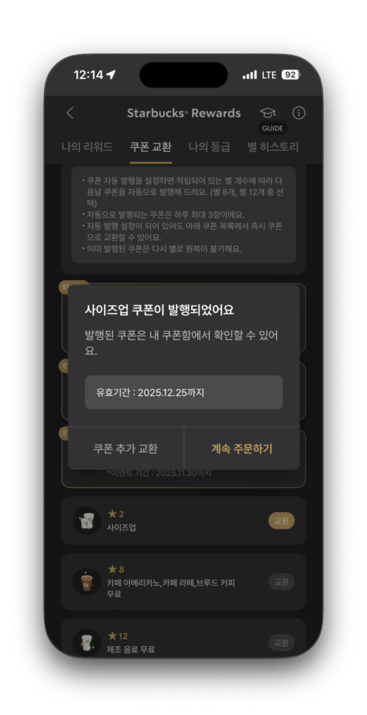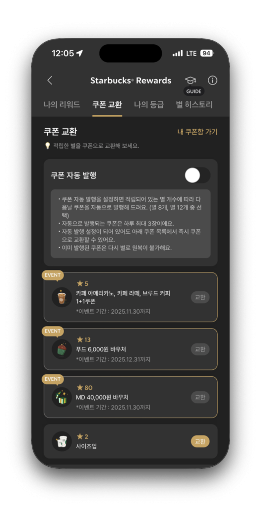 예전에는 별 12개가 쌓이면 자동으로 무료음료 쿠폰으로 바뀌어서, 한 달 안에 무조건 써야 했어요. 지금은 내가 원할 때 앱에서 직접 “별 → 쿠폰”으로 바꾸는 방식이라, 선택지가 훨씬 많아졌습니다.
