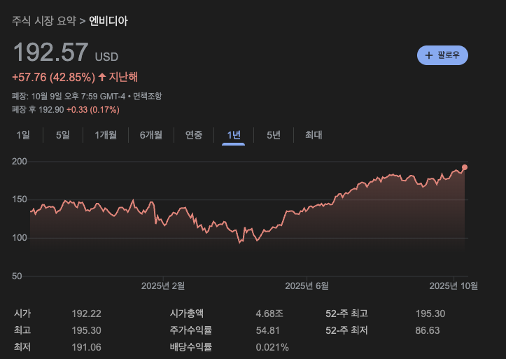| PER (주가수익비율) | 약 39.8배 | AI 성장 기대가 반영된 높은 밸류에이션 |