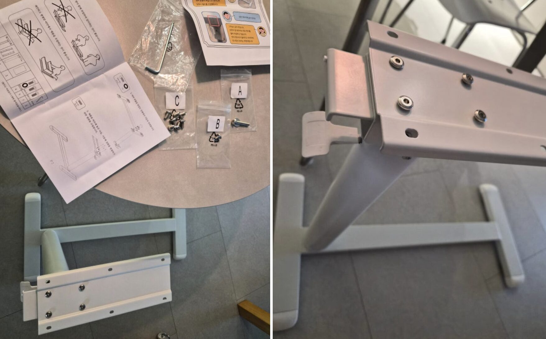물론 사용하면서 주의해야 할 점도 있었어요. 처음 조립했을 때 높이 조절이 안 돼서 당황할 수 있는데, 이는 배송 중 갑자기 상판이 튀어 오르는 것을 방지하기 위해 초기 압력을 강하게 세팅해두었기 때문이었어요. 뒤집어서 나사 세 개를 살짝 풀고 조절하면 그다음부터는 아주 잘 작동하니 불량이라고 걱정하지 않으셔도 돼요.