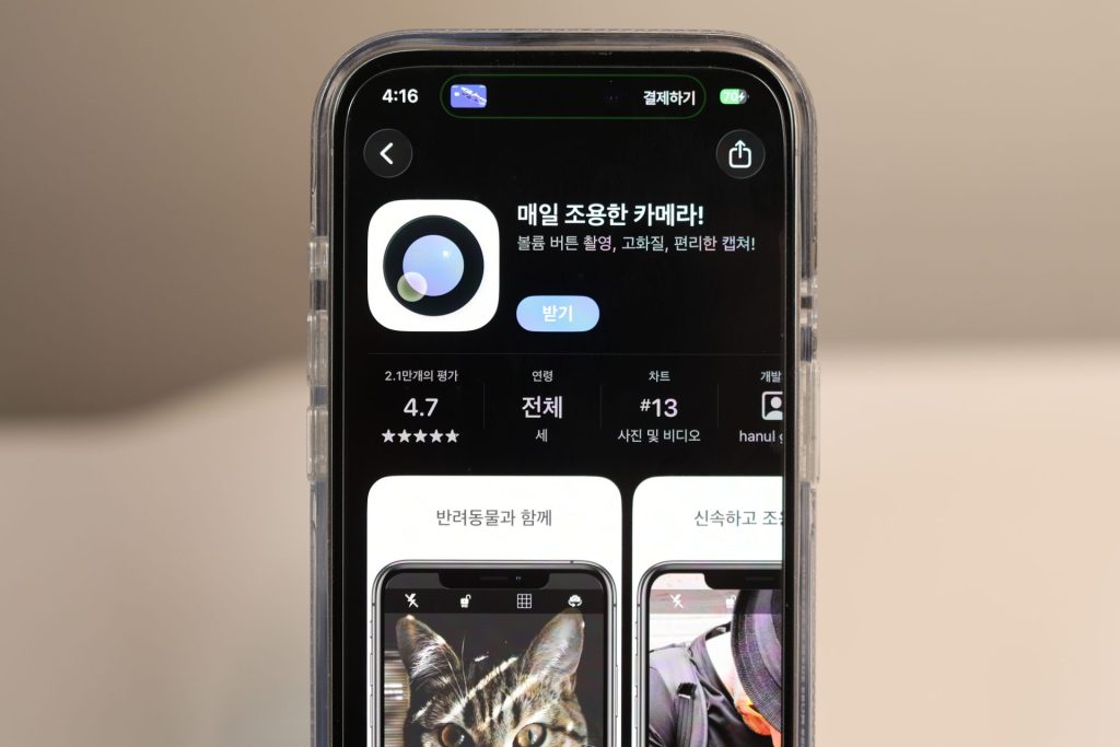 아이폰의 기본 카메라 앱은 어쩔 수 없지만, 별도로 스토어에서 다운받은 카메라 앱은 자체적으로 무음 촬영을 지원해요. 그래서 앱스토어에서 ‘무음 카메라’를 검색해 보면 카메라 앱이 정말 많이 나옵니다.