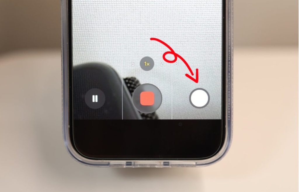 3. 녹화가 진행되는 동안 화면 구석에 뜨는 하얀 동그라미 버튼을 누르면, 동영상은 계속 촬영되면서 동시에 사진을 찍을 수 있어요.
